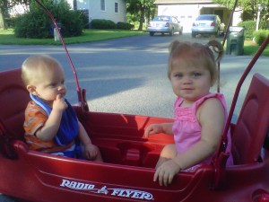 Yesterday Jenn and her friend Susan went out to dinner and Ryan’s friend Gracie spent the evening with us. It was a good opportunity for the two moms to enjoy some wine and adult conversation. It was also a great opportunity for Ryan to socialize! At first he couldn’t figure out whether he wanted to share his wagon or not. He eventually conceded and welcomed the company. As you can see the little man seemed confused by his young lady friend. My advice to Ryan when he reads this blog years from now? Always share the wagon and keep your fingers out of your mouth.