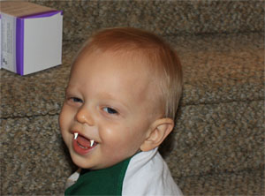 Did you know, ironically enough, that the eye teeth are less commonly known as the “canines.”  I’m not a dentist but I believe this term was derived from the fact that, much like a dog, the children become the beasts of the animal kingdom.  If it weren’t for the locks on the doors, I’m fairly certain Ryan would run out on a full moon and start chasing cars and eating cats.  It really has become that bad!  One dentist cleverly describes how cute it is when the baby’s first teeth come in saying, “The real joy is watching your little baby become a child capable of eating small amounts of solid food.”  Cute..yeah sure.  That same dentist wisely describes the eye teeth as, “the teeth most aptly used for tearing food.”  He continues, “they typically erupt at 16 months.”  Erupt!  That, my friends, is the understatement of the century!  As I prepare for bed, I laugh at the word erupt.  Whatever is going on in this young man’s mouth is far from done “erupting” but I think my tear ducts might “erupt” if we can’t make it past this stage.  Of course, my boss Marc was kind enough to remind me that the terrible twos are just around the corner.  Oh, I can’t wait.