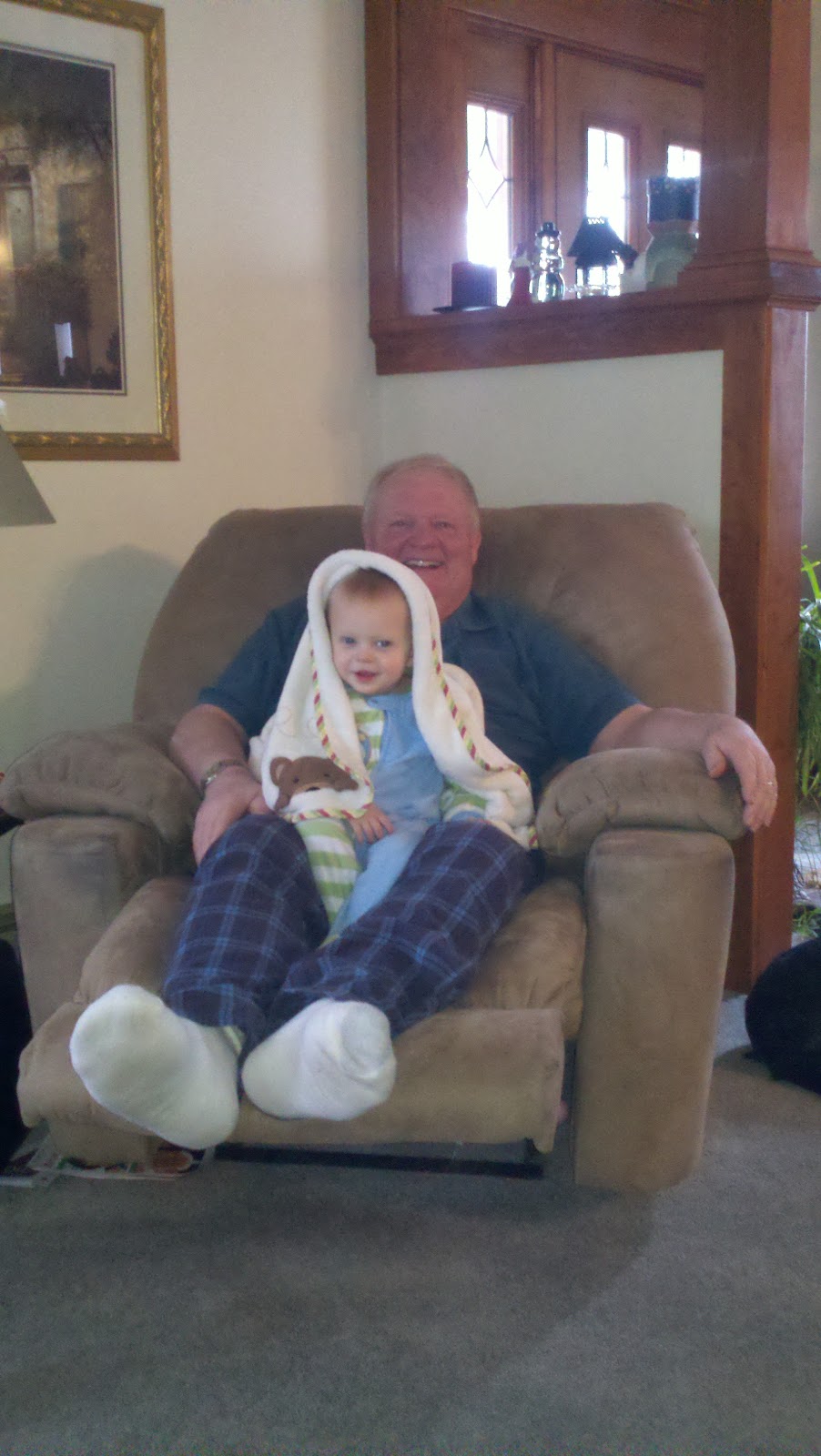 Ryan has continued his unfortunate habit of waking up at 5:30 am, no matter what time he goes to bed.  You’d think that he’d wake up very grouchy (as his parents do) but that’s not the case.  Take, for example, this picture of Papa and Ryan trying to recreate Mother Mary’s garbs.  Pretty cute!