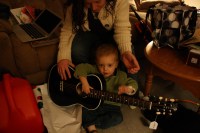 Christmas came early in Corning this year and our little spoiled man was not disappointed. His Uncle Joey delivered a home run with his very own little real guitar. Though he doesn’t really understand what’s going on, he knows that he’s being showered with gifts. On more than one occasion tonight he said, “Happy Birthday.” Though I guess you could say it’s someone’s birthday, we’ve got a bit of work to do in this department.