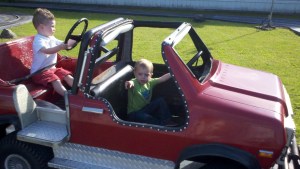 Imagination is really a pretty cool thing. It’s not every day that a three year old can drive a big red truck with some strange kid with a weird mohawk riding in the back. Now, reality would tell you that this is one strange truck, in all actuality the kind of truck that most couples could really use on long road trips. Equipped with two steering wheels, an open top and chrome bumpers, this truck will allow you to drive independently of each other while still going in the same direction. Now, there are deep philosophical analogies here, right, like in this case no matter how hard you try and steer in one direction or the other, the truck still goes in the path it’s intended to go. Right, deep, eh? Or, you can look at this as another opportunity to post a really cute picture of Mr. Ryan. I’ll go with the later. Enjoy!